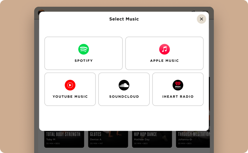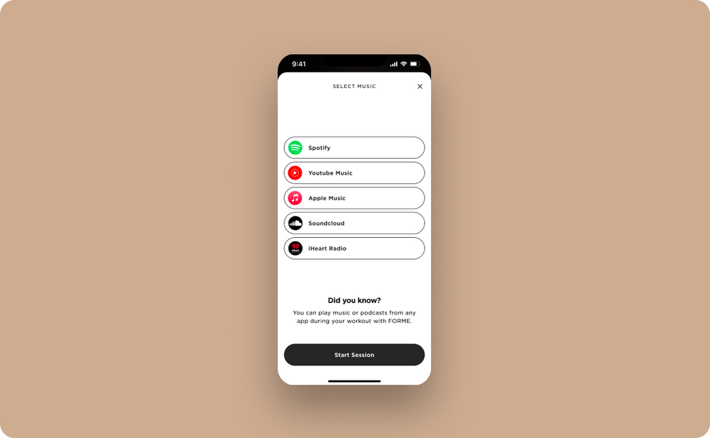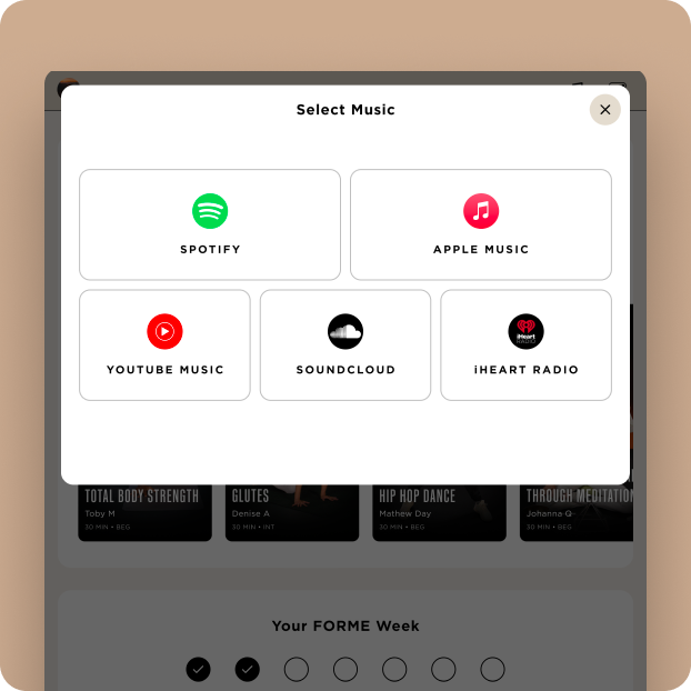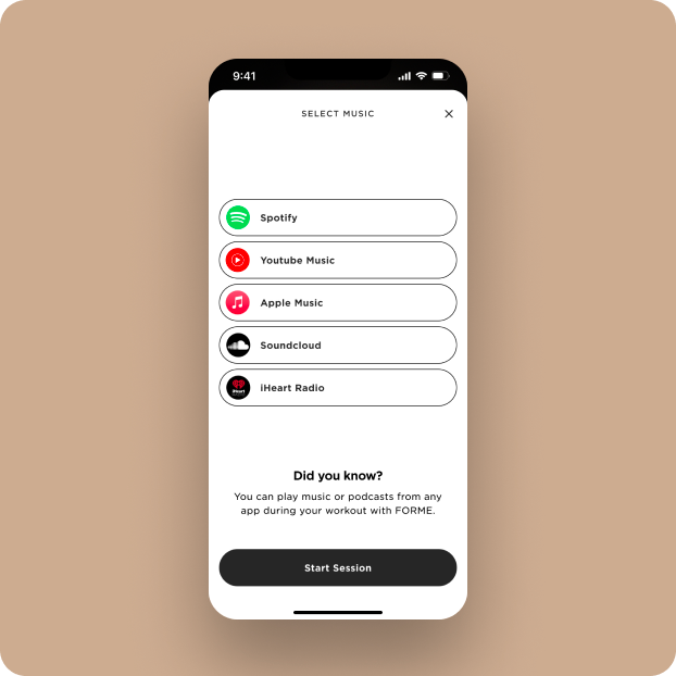 When working out using the FORME app, you can play music or podcasts from any app on your phone. We help you out by making it easy to switch to some of the most popular services.